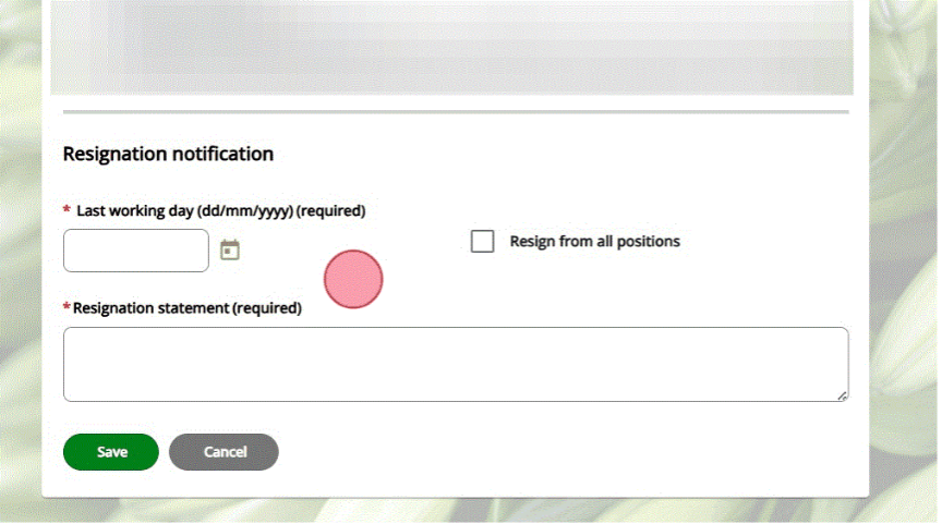 5. Scroll to the bottom and click Resignation Notification. Complete your last working day and the reason why and click Save
